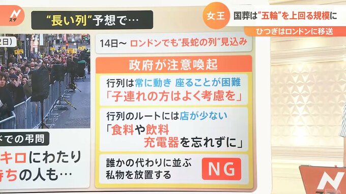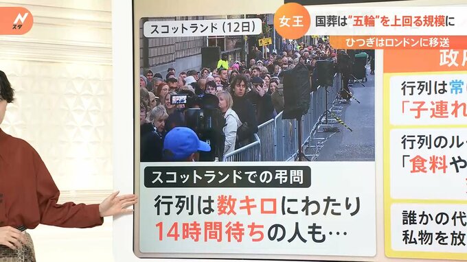ロンドンでは大変多くの方が弔問に訪れる見通しになっています。スコットランドでの弔問の行列は数キロにわたり14時間待ったという人の声もありました。そのため政府は注意喚起を行っています。