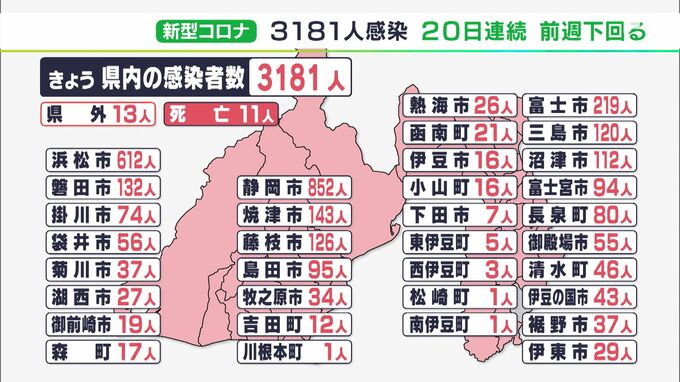 静岡県内では9月13日、新たに3181人が新型コロナウイルスに感染したことがわかりました。20日連続で前の週の同じ曜日を下回っています。感染者を自治体別に見ますと、静岡市で852人、浜松市で612人、富士市で219人…