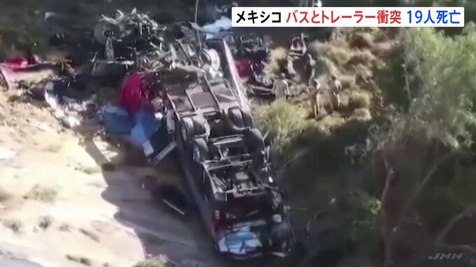 メキシコ中部の高速道路で、バスがとうもろこしを積んだトレーラーに衝突する事故がありバスに乗っていた19人が死亡しました。ロイター通信などによりますと、メキシコ中部のサカテカスの高速道路で26日、バスが、…