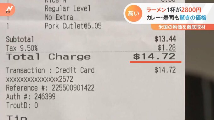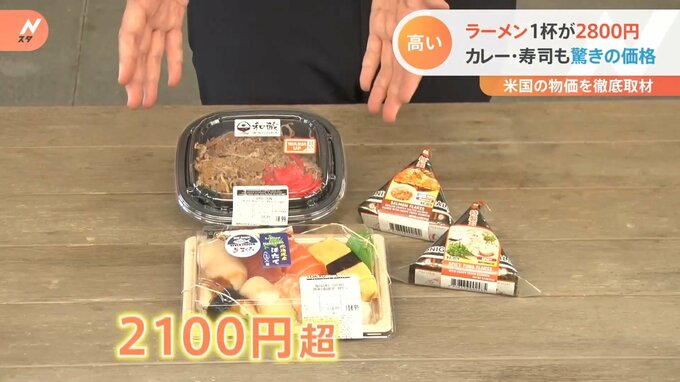 さらに、現地のスーパーでも、弁当の価格を調べてみました。レストランを使うよりは比較的、安くなるといいますが…ツナのおにぎりと鮭のおにぎりはそれぞれ1個、およそ270円。そして、牛丼は1285円ほど。