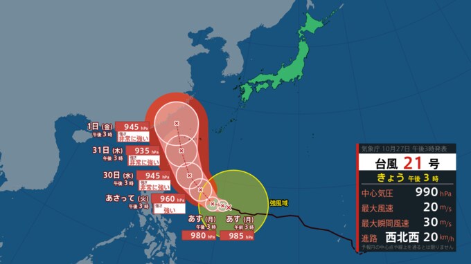 【台風情報】台風21号「コンレイ」は今後「非常に強い勢力」で沖縄の南に接近か 台風20号「チャーミー」はノロノロ迷走も『ベトナム』上陸 台風の現在の様子と最新進路予想は? 青森テレビ 2024年10月27日(日) 16:25 国内 最新台風進路予想図