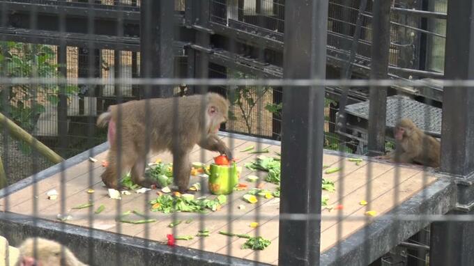 ヤクシマザルには、ハロウィンの定番「カボチャ」ではなく冬瓜(とうがん)に詰め込んだ果物が贈られると、ボスザルの「ぽんすけ」が…いち早く柿を手に取り美味しそうに頬張りました。