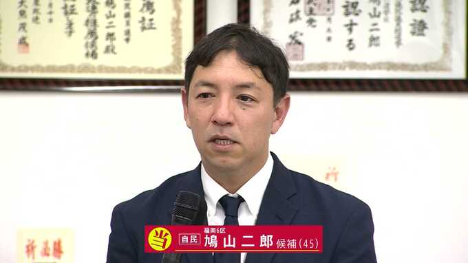 27日に投票が行われた衆議院選挙で、福岡6区から出馬した鳩山二郎氏(45)の当選が確実となりました。福岡6区には、【自民・前】鳩山二郎氏(45)【国民・新】近藤雅彦氏(49)【参政・新】古川恭司氏(58)【維新…
