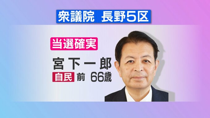 衆院選信毎開票速報~SBC~ 衆院選の長野5区で、自民党の前職 宮下一郎さんの7回目の当選が確実になりました。