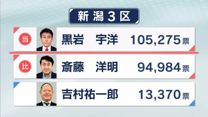 新潟3区は、立憲民主党の黒岩宇洋さんが、1万票以上の差をつけて議席を奪還しました。自民党の斎藤洋明さんは、比例で復活当選です。