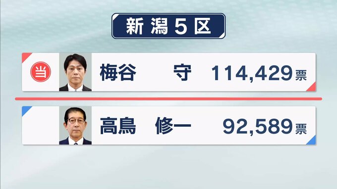 新潟5区は、立憲民主党の梅谷守さんが、およそ2万2000票の差で自民党の高鳥修一さんとの一騎打ちを制しました。