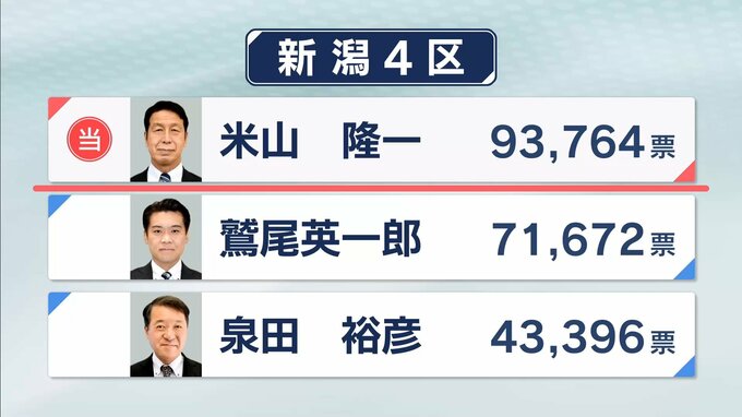 新潟4区は、立憲民主党の米山隆一さんが、自民党の鷲尾英一郎さんに2万2000票以上の差をつけて2回目の当選です。