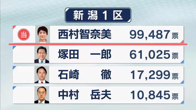 新潟1区は、立憲民主党の西村智奈美さんが、次点の塚田一郎さんに3万8000票以上の差をつけて7期目の当選となりました。