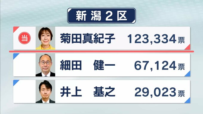 新潟2区は、立憲民主党の菊田真紀子さんが、無所属の細田健一さんらに5万6000票以上の差をつけて当選しました。