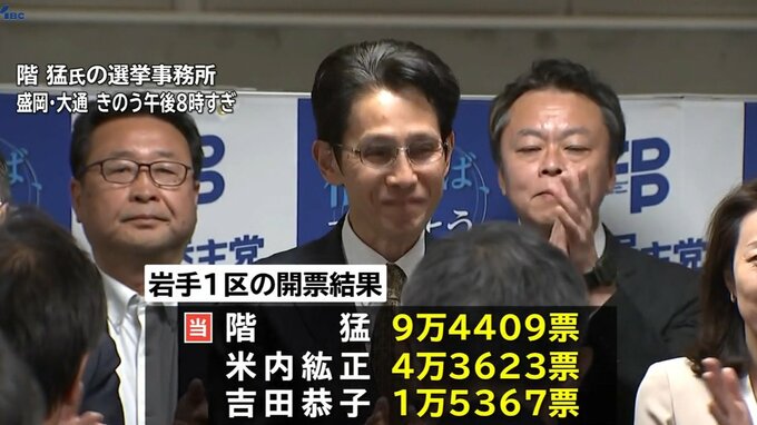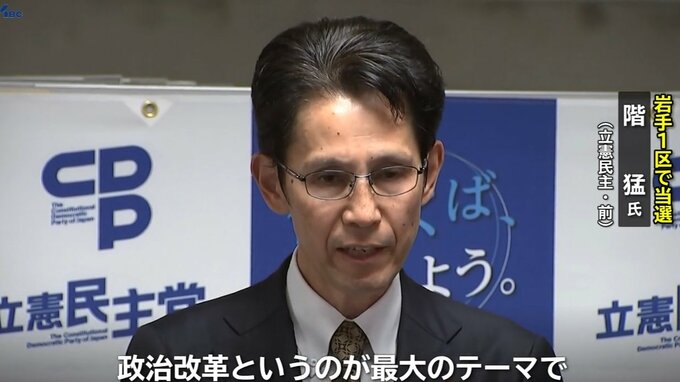 岩手1区は立憲民主党の前職、階猛氏がおよそ9万4000票を獲得し、次点の候補に5万票あまりの大差をつけて7回目の当選を果たしました。