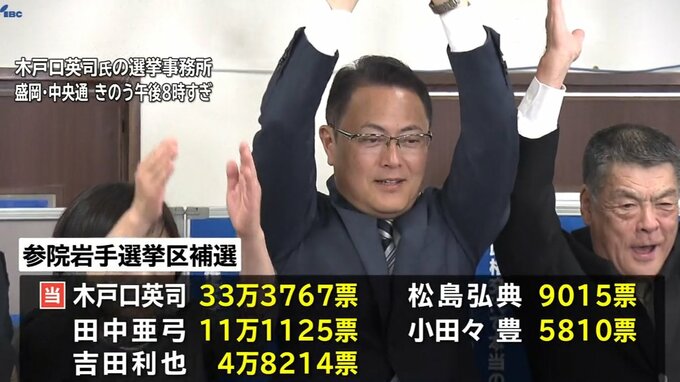 また、同じく27日投票が行われた参院岩手選挙区の補欠選挙は、立憲民主党・元職の木戸口英司氏がおよそ33万4500票を獲得して2回目の当選を果たしました。