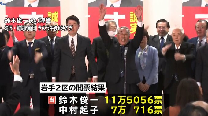 岩手2区は自民党の前職で党の総務会長を務める鈴木俊一氏が、およそ11万5000票を獲得し、11回目の当選です。
