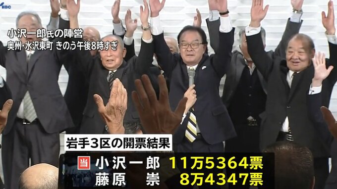 岩手3区は立憲民主党の前職、小沢一郎氏が自民党の前職、藤原崇氏に3万1000票あまりの差をつけて選挙区の議席を奪還しました。