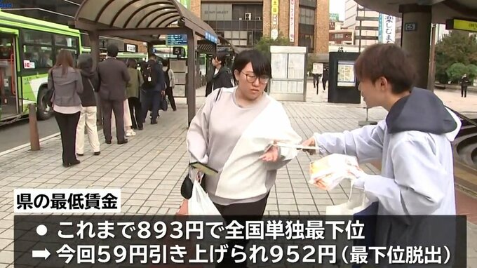 県の最低賃金はこれまで893円で全国単独最下位でしたが、今回、59円引き上げられて952円となったことで、最下位を脱出しました。