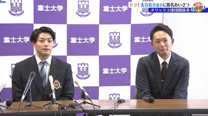 プロ野球オリックス・バファローズの球団関係者が富士大学を訪れ、ドラフト会議で1位指名した麦谷祐介選手に指名のあいさつをしました。オリックス一行)おはようございます。富士大 安田監督)「今日よろしくお願…