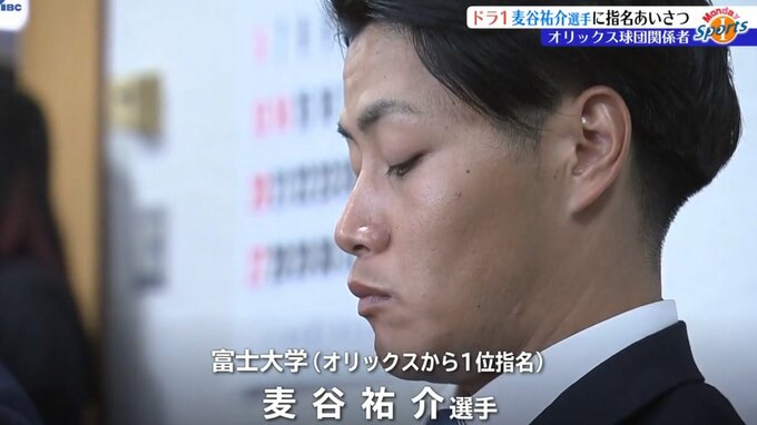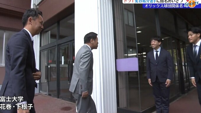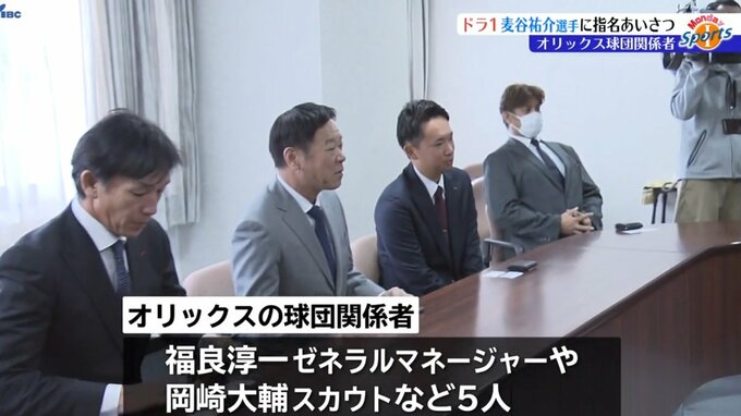 プロ野球オリックス・バファローズの球団関係者が富士大学を訪れ、ドラフト会議で1位指名した麦谷祐介選手に指名のあいさつをしました。
