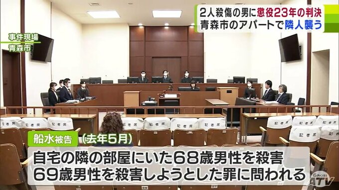 2023年、青森市のアパートで1人を殺害し、1人を殺害しようとした罪に問われていた男の裁判員裁判で、青森地裁は男に懲役23年の実刑判決を言い渡しました。