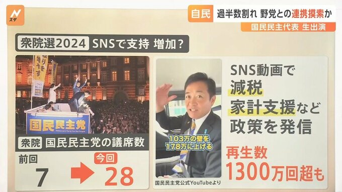 これまで国民民主党は7議席でしたが、今回は4倍の28議席になりました。SNS動画で減税や家計支援などの政策を発信したことが影響をもたらしたのではないかといわれています。なかには再生数が1300万回を超えている動画もあるということです。