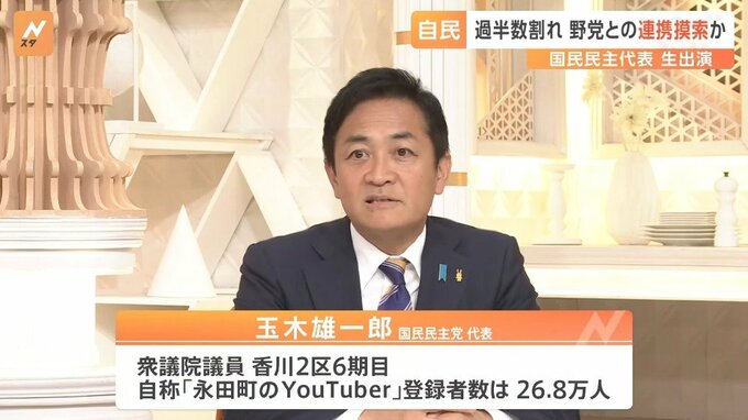 過半数を割り込んだ自民党は、政権の維持のためには野党との連携が欠かせないということで、連携を模索しています。これに対し、国民民主党の玉木雄一郎代表は「連立政権への参加はない」と明言しています。一方で、「政策本位で良い政策があれば協力するし、ダメなものはダメと言っていく」とも話していて、気になるところです。