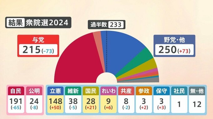 今回の選挙では、自民党(191議席)と公明党(24議席)の与党は215議席と、過半数である233議席を割り込む結果となりました。また、立憲民主党は148議席と躍進し、国民民主党は28議席、れいわ新選組も9議席と数を伸ばしました。