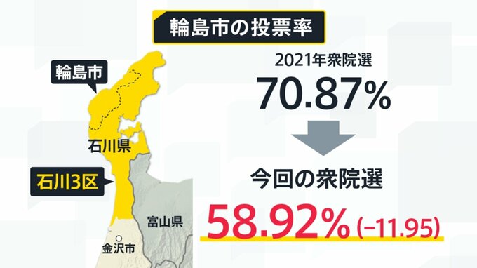 前回・2021年の衆議院選挙の投票率は、全国平均が約55%と言われる中で輪島市の投票率は70.87%と非常に高かった。しかし、今回の衆議院選挙では58.92%と11.95ポイント以上も減りました。