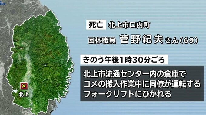 28日午後、岩手県北上市でコメの搬入作業をしていた69歳の男性が同僚の運転するフォークリフトにひかれて亡くなりました。亡くなったのは北上市口内町の団体職員・菅野紀夫さん(69)です。警察と消防によりますと…