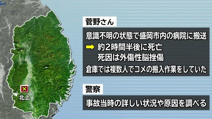 警察と消防によりますと、菅野さんは28日午後1時半ごろ、北上市流通センター内の倉庫でコメの搬入作業中に同僚が運転するフォークリフトにひかれました。