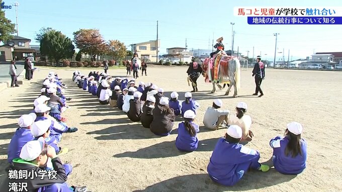 装束を身にまとった馬コが29日滝沢市の小学校を訪れ、児童と触れ合いました。