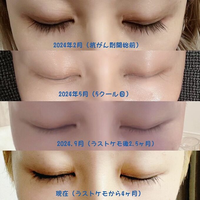 西丸さんは、「2024年2月(抗がん剤開始前)」から「現在(ラストケモから4ヶ月)」の間の4枚の写真を1つにまとめた写真を投稿。「抗がん剤5クール目」という写真ではまつげは全く無くなってしまっていますが「ラストケモ」を経た2枚の写真では徐々にまつげが戻ってきている様子が分かります。