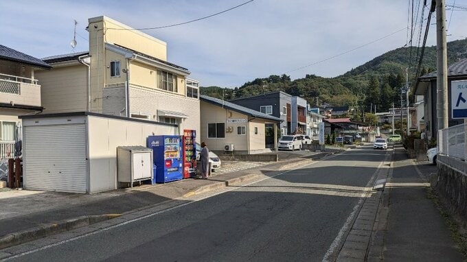 こちらがその住宅地。よく見ると、見慣れた飲料の自販機の隣に、何かを売っている自販機がもう一台・・・何を売ってるのかな?