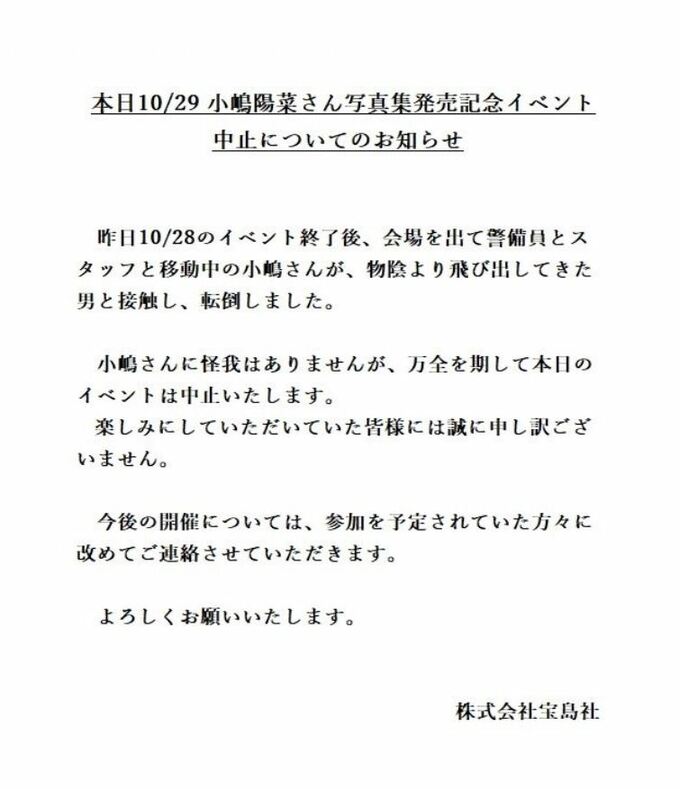「小嶋陽菜写真集」の公式Xは29日午後、「本日10/29 小嶋陽菜さん写真集発発記念イベント中止についてのお知らせ」とのタイトルで「10/28のイベント終了後、会場を出て警備員とスタッフと移動中の小嶋さんが、物陰より飛び出してきた男と接触し、転倒しました」と説明。