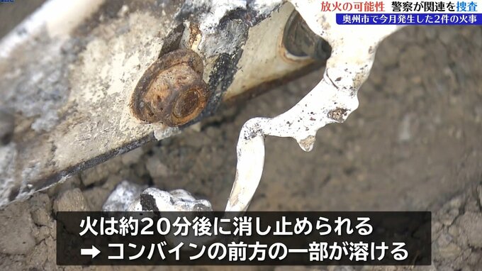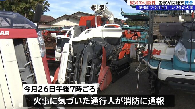 コンバインを焼いた火事の現場からおよそ3キロ離れた奥州市前沢生母では16日、北上川東部土地改良区の敷地内に設置されていた自動販売機1台を焼く火事が発生していて、警察は放火の可能性も含めて捜査するとともに2つの火事の関連を調べています。