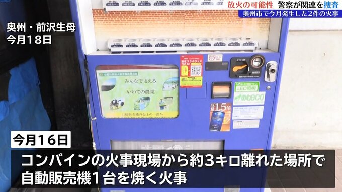 奥州市内では16日にも自動販売機を焼く火事が起きていて、警察はいずれも放火の可能性があるとみて関連を含めて捜査しています。