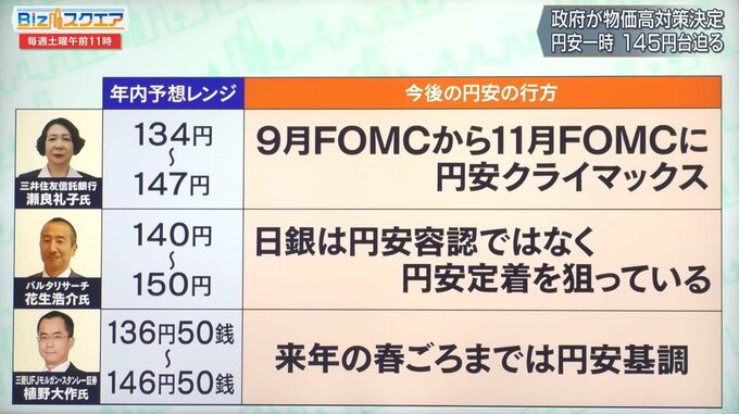 三井住友信託銀行の瀬良礼子氏は「9月のFOMCから11月のFOMC に円安のクライマックスがある」、バルタリサーチの花生浩介氏は「日銀は円安容認ではなく、円安定着を狙っている」、三菱UFJモルガンスタンレー証券の植野大作氏は「来年の春頃までは円安基調が続く」とみている。三人とも予想レンジは近いが、瀬良氏は「ピークは今秋後半」としているが、植野氏は「来春ごろまで円安」と見方が分かれている。「円安定着を狙っている」というのは、黒田総裁のインタビューを見ても「経営の不透明感が増すから円安が良くない」と言っているが、「円安が国民生活に打撃を与えるからいけない」とか「水準が安すぎる」とかそういうことは言ってない。