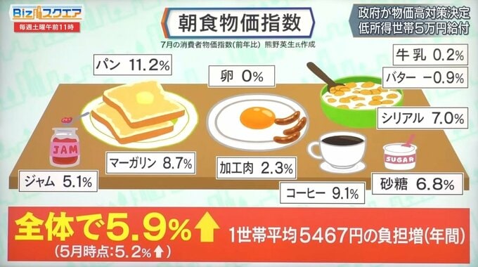 政府は7月の消費者物価指数は前年同月比2.4%の上昇と言っているが、身近な朝食物価指数を見ると5.9%で、5月時点の5.2%から上昇率が上がっている。