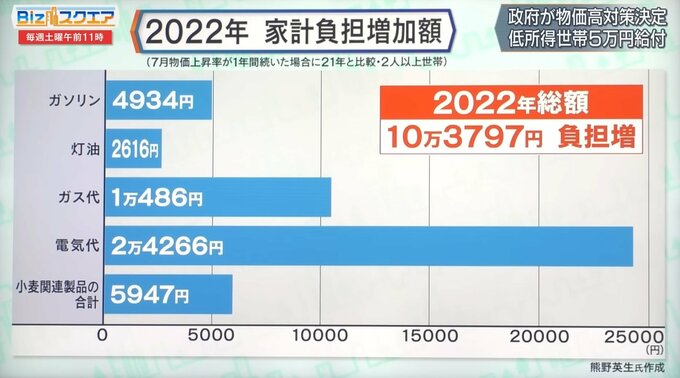 104,000円と、これはものすごく大きいとしか言いようがありません。普通の共働きで年間10万円以上給料を増やせるかというと無理です。内訳を見てみると、やはり電気代が痛いです。毎月電気料金を見るとまた上がったかという気がするのです。負担増の4分の1が電気代。さらにガス代、ガソリン代など物価対策で上がらないようにしているのですが、前年と比べると負担増が非常に大きいです。
