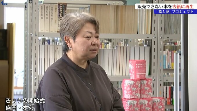 29日の開始式には古紙再生に欠かせない背表紙からページを切り離す作業を担う、盛岡市の知的障害者の通所施設「さわら園」の利用者も出席してプロジェクトのスタートを祝いました。