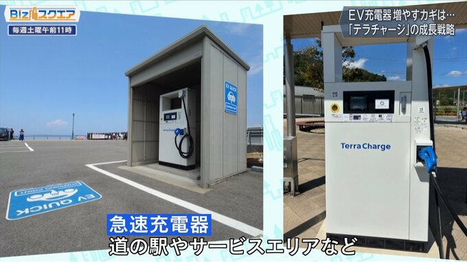テラチャージが展開する充電器は、マンションやホテルなどに設置される「普通充電器」のほか、道の駅やサービスエリアなど、短時間で充電を行う「急速充電器」がある。家電量販店のコジマでは、2024年6月から急速充電器を設置している。コジマは「主要幹線道路沿いに多く出店しているため、車で来店する客が多い。買い物に来た客が、買い物の間に充電をする。充電に来た客が待っている間に買い物するなど、メリットがある」という。