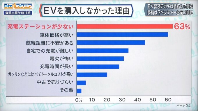 EVが普及しないのは充電器がないからなのか、あるいは充電器がないからEVが普及しないのか。理由について見ていくと、最も多かったのが「充電ステーションが少ない」という理由。さらに「車体価格が高い」という声も多くあった。また「航続距離に不安がある」「自宅での充電が難しい」「電欠が怖い」などが続く。