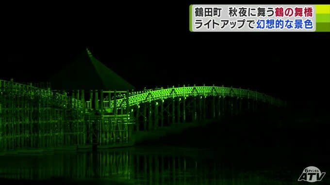 青森県鶴田町の廻堰大溜池にかかる「鶴の舞橋」のライトアップが行われていて、7色に染まる幻想的な景色が広がっています。秋の夜に色鮮やかに浮かび上がる鶴田町の「鶴の舞橋」です。鶴が羽を広げたように見える…