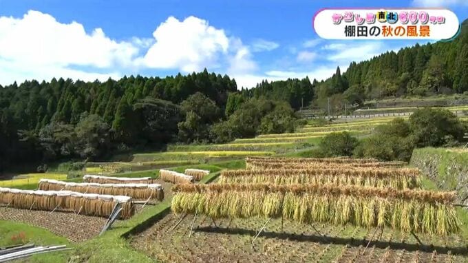 各地の話題をお伝えする「かごしま南北600キロ」、今回は棚田の風景です。鹿児島市郡山町の八重地区です。甲突川の源流域にあたり、急傾斜地に棚田が広がっています。標高677メートル、およそ240枚からなる石積み…