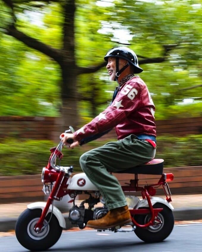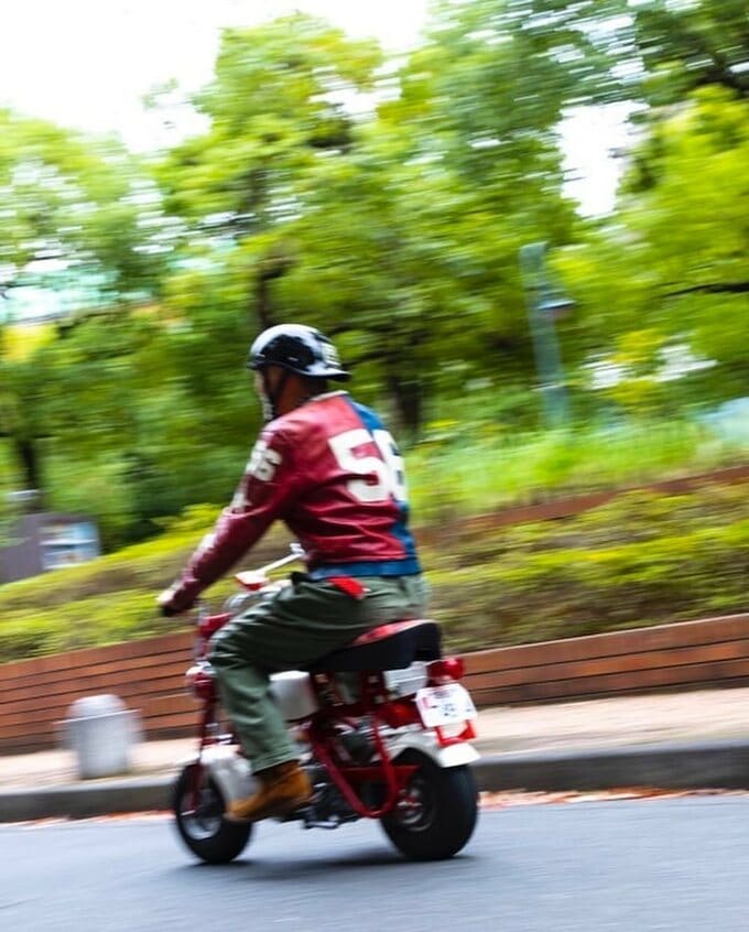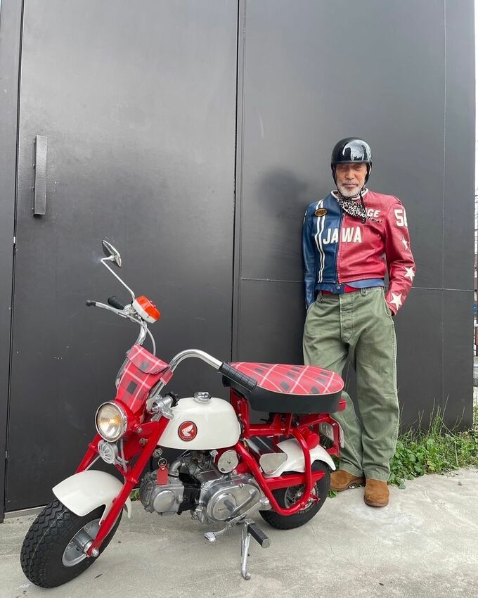 テリーさんは向かって左を青・右を赤に染め抜いた革ジャンに、アーミーグリーンのワークパンツとスエードのブーツを合わせ、しっかりとヘルメットを被って笑顔で「モンキー」を駆っています。