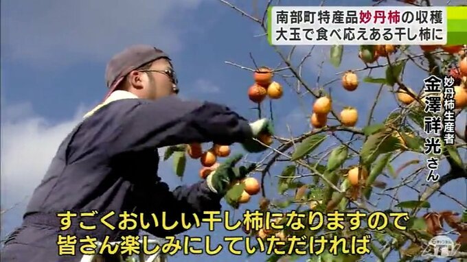 秋の味覚の収穫です。青森県南部町では、干し柿などに加工される町の特産品「妙丹柿」の収穫が最盛期を迎えています。