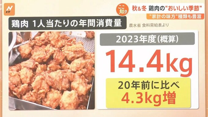 農水省の食品需給表によると、鶏肉の1人当たりの年間消費量は14.4kg(2023年度 概算)で、20年前に比べて、4.3kg増えているということです。