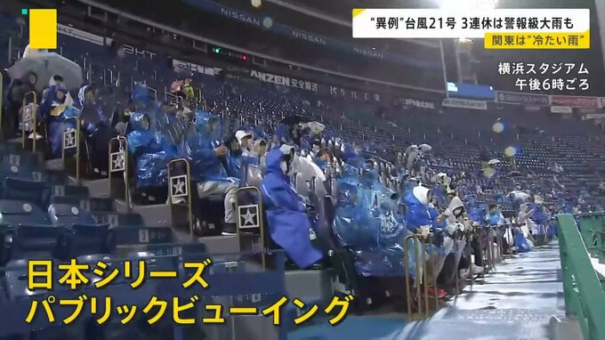29日夜、横浜スタジアムでは日本シリーズのパブリックビューイングが行われました。午後6時の横浜の気温は13.1℃。ときより雨脚が強まることもありましたが…