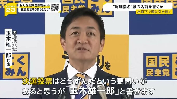 「首班(総理)指名選挙がまだいつになるかよくわかりませんけれども、その際に書くのは『玉木雄一郎』です。決選投票はどうすんだという更問いがあると思うが、『玉木雄一郎』と書きます」