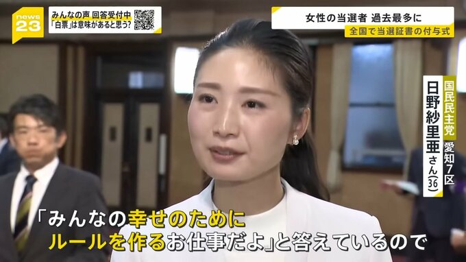 今回の選挙で躍進した国民民主党の日野紗里亜さん。4人の子供を育てながらの立候補で、60万円の不記載で総務大臣を辞任した鈴木淳司さんを相手に、4万票差で初当選を勝ち取りました。