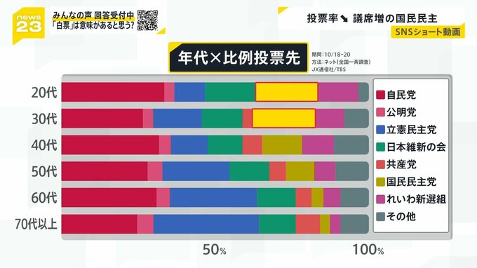 投票1週間前に実施した調査では、多くの20代~30代が投票先として国民民主党を選んでいます。