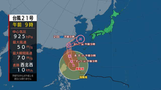大型で非常に強い台風21号(コンレイ)は、31日には非常に強い勢力で沖縄の南から台湾付近に進む見込みで、沖縄では11月1日にかけて非常に強い風が吹くほか、31日には猛烈なしけとなる所があるとして、気象庁は厳重な警戒を呼びかけています。