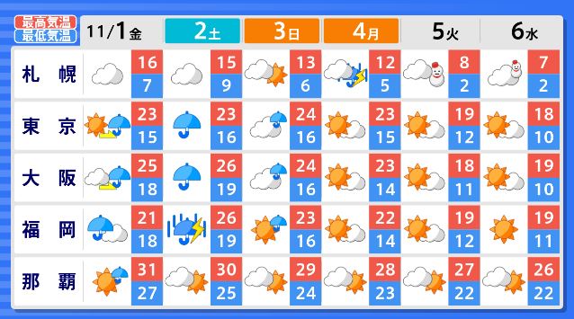その後、11月2日には温帯低気圧に変わる見込みですが、前線の活動が活発になることから九州から東北にかけて広く雨が降り、所によっては季節外れの大雨となる所もありそうです。